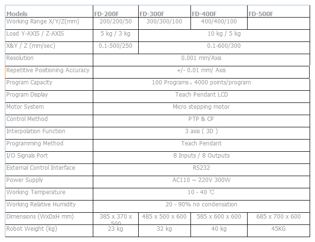 Features *The popular robot in FD series robots *Dispensing Area 200 X 200 X 50 ,300 X 300 X 100 and 400x400x100 mm *Dot, Lines, Arc etc. and 3D dispensing path is available. *100 programs, 4000 points per program *A hand-held Teach Pendant is provided for simple and intuitive programming functions *SRE software is available for CAD file input (optional) *Apply adhesives, cyanoacrylates, silicone, RTV, anaerobic resin, epoxy, UV cure formulations and many more fluids. *Every robot will be with one small dispenser controller TS9150,tips barrels etc as full unit ![]() |